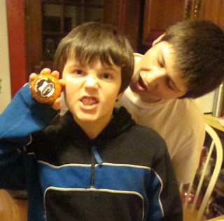 I have no idea why Carter is making that face or why Caleb is about to bite his brother's ear..I guess the chocolate orange brings out the vampire in people..